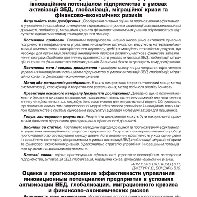 Оцінка та прогнозування ефективності управління інноваційним потенціалом підприємства в умовах активізації ЗЕД, глобалізації, міграційної кризи та фінансово-економічних ризиків