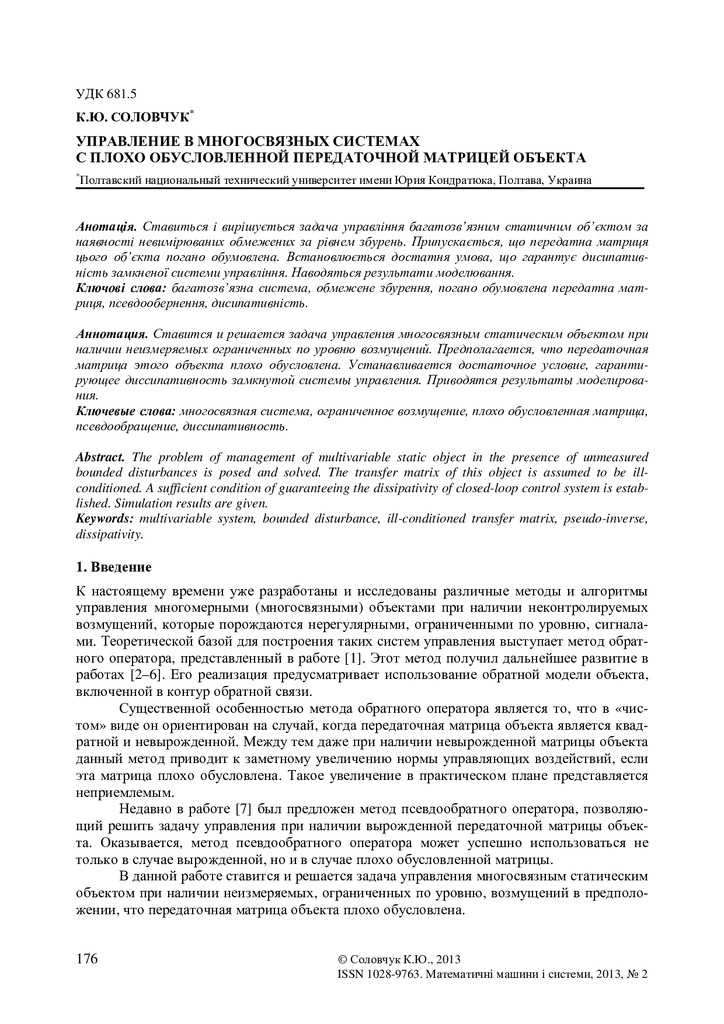 Ставиться і вирішується задача управління багатозв’язним статичним об’єктом за наявності невимірю...