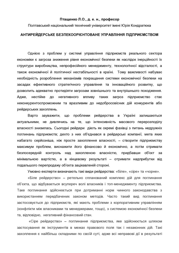 Антирейдерське безпекоорієнтоване управління підприємством