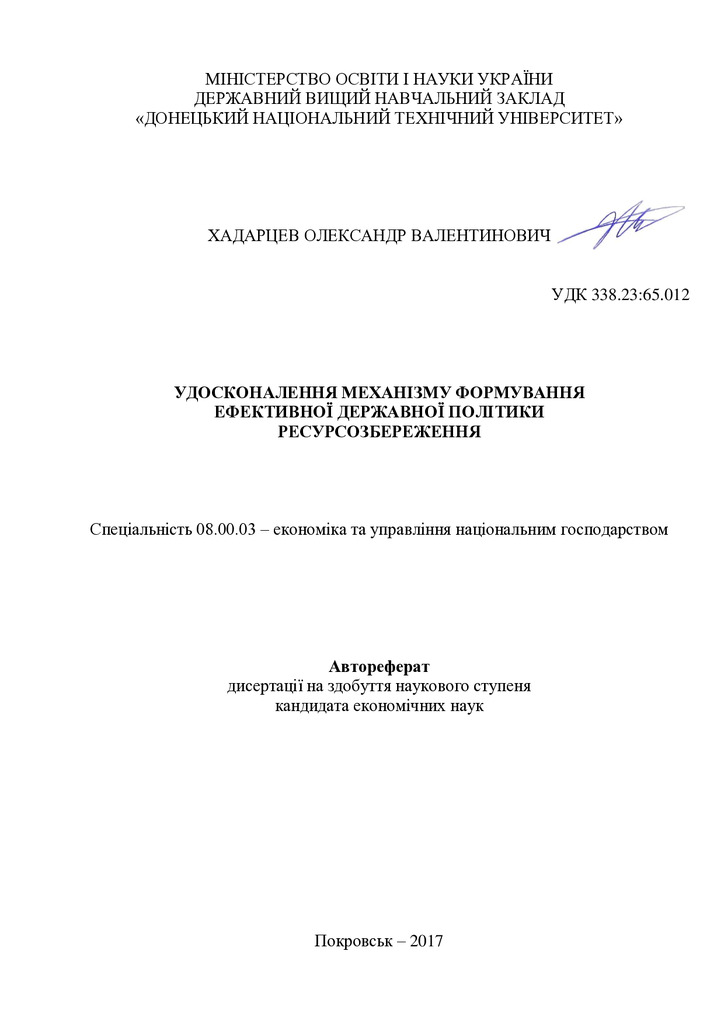 Удосконалення механізму формування ефективної державної політики ресурсозбереження