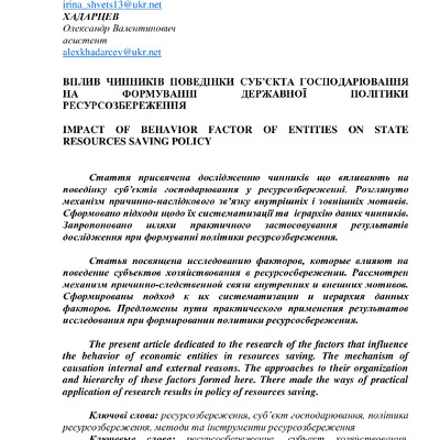 Стаття 2016/06/30Вплив чинників поведінки суб’єкта господарювання на формування державної політики ресурсозбереження