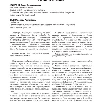 Розглянуто економічну природу ризиків у діяльності банку, підходи до трактування цієї категорії, ...