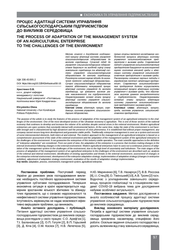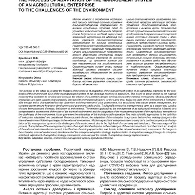 Стаття 2022/12/27Процес адаптації системи управління сільськогосподарським підприємством до викликів середовища