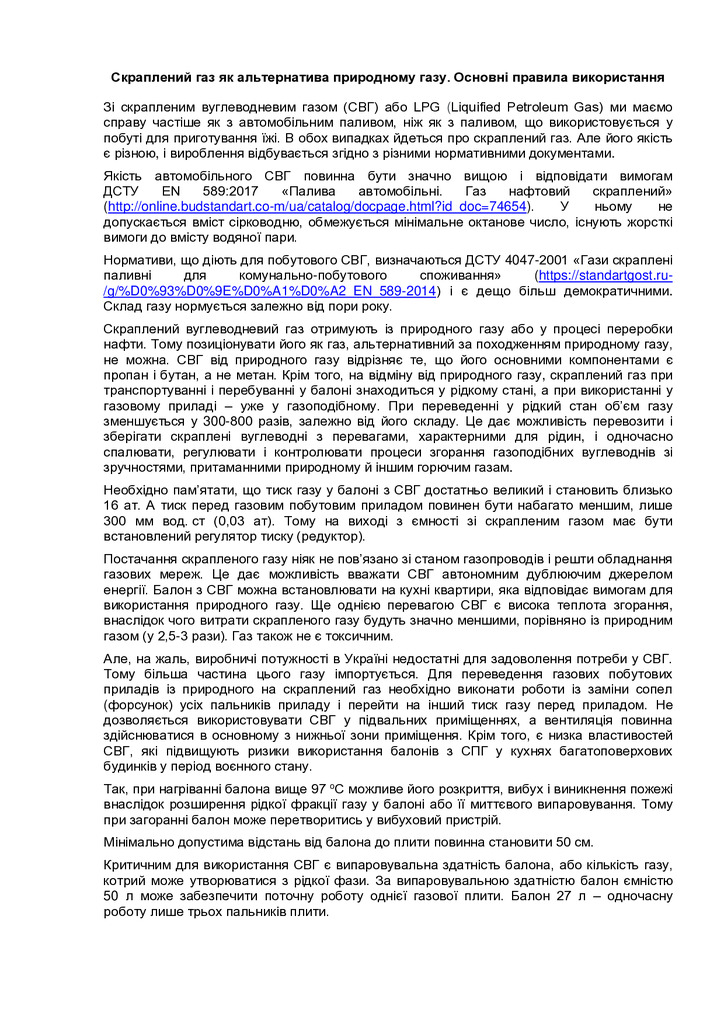 У статті розглянуто проблеми використання скрапленого вуглеводневого газу СВГ (LPG) як виду палива, яке дублює природний газ, що збільшує сталість енергетичної системи.