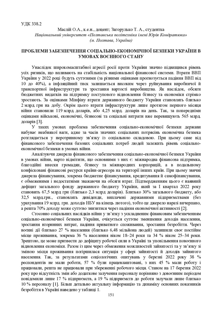 Фінансове забезпечення соціально-економічної безпеки України в умовах воєнного стану