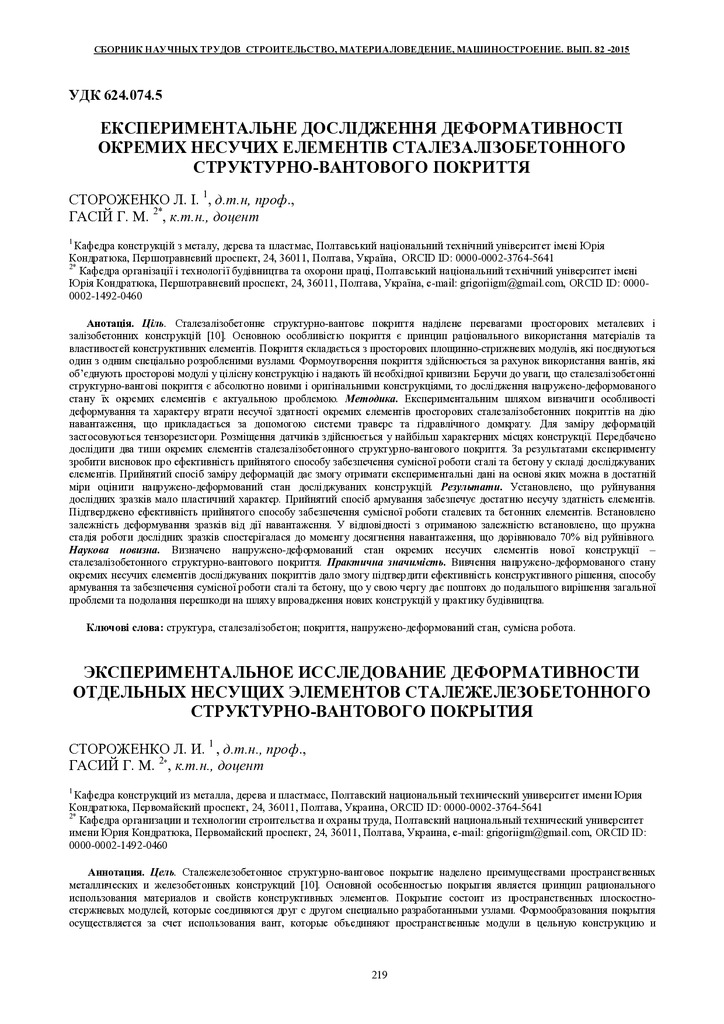 Стаття 2020/06/25Експериментальне дослідження деформативності окремих несучих елементів сталезалізобетонного структурно-вантового покриття [Електронний ресурс] /
