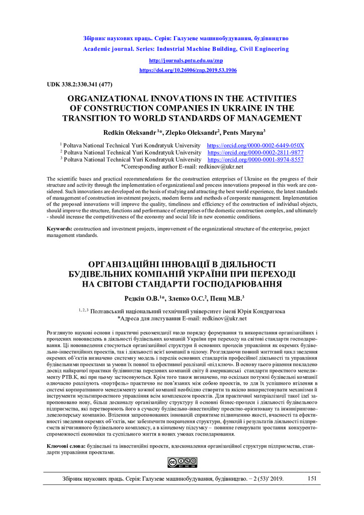 Organizational innovations in the activities of construction companies in Ukraine in the transition to world standards of management