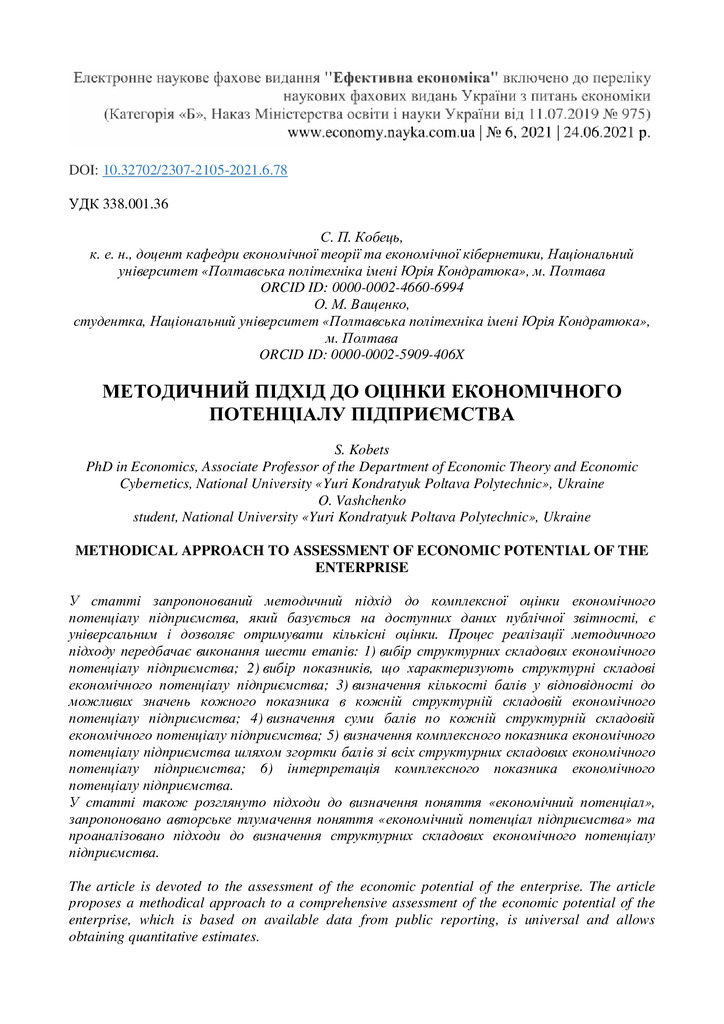 Методичний підхід до оцінки економічного потенціалу підприємства