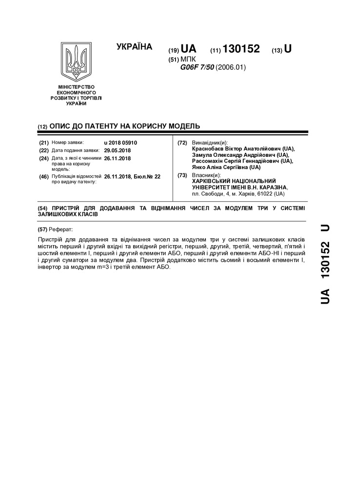 Пристрій для додавання та віднімання чисел за модулем три у системі залишкових класів