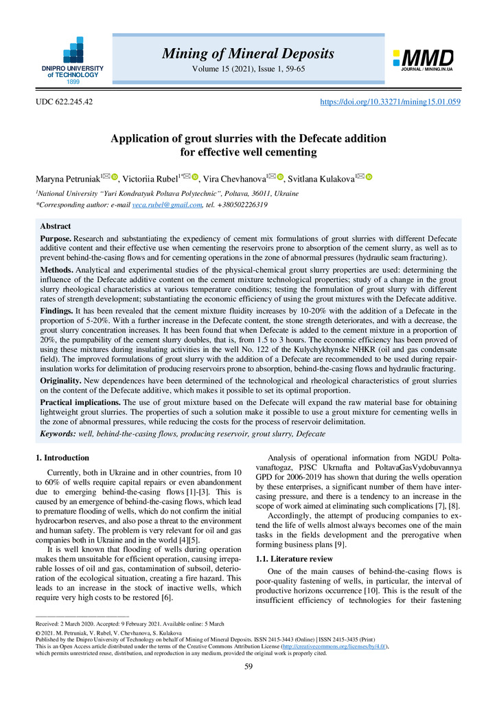 Application of grout slurries with the Defecate addition for effective well cementing