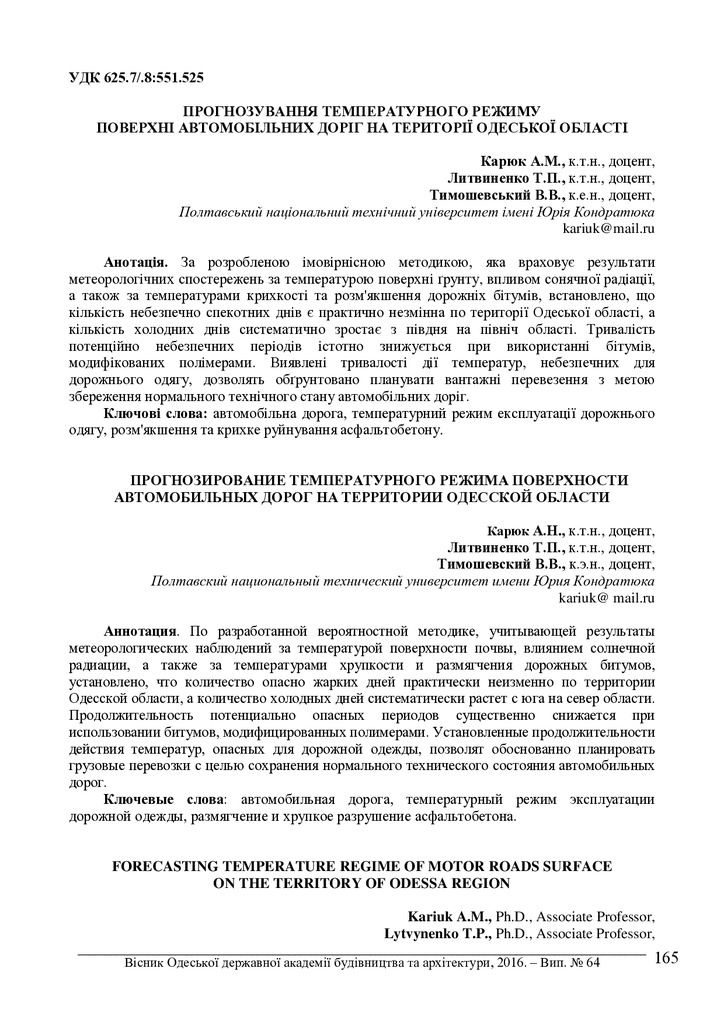 Прогнозування температурного режиму поверхні автомобільних доріг на території Одеської області