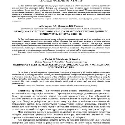 За результатами статистичного аналізу метеорологічних даних встановлено зв'язок між температурою атмосферного повітря та температурою асфальтобетонного дорожнього одягу. Виявлені залежності дозволя...