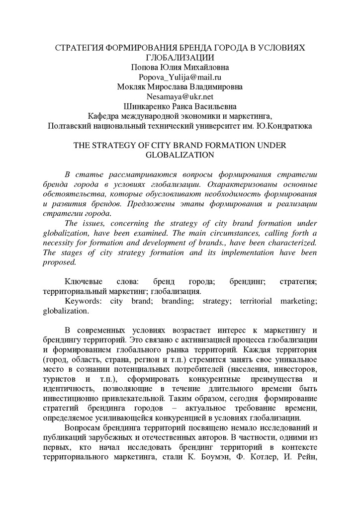 Стратегия формирования бренда города в условиях глобализации