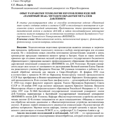 Стаття 2020/03/04Опыт разработки технологии изготовления изделий «Памятный знак» методом обработки металлов давлением