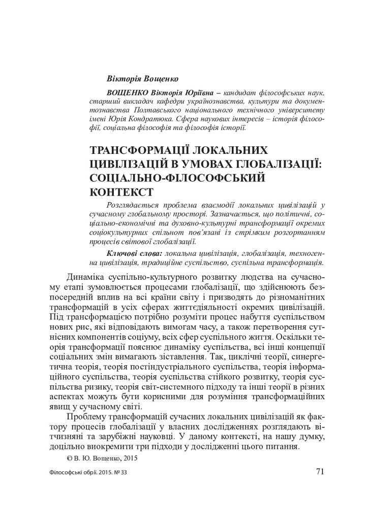 Трансформації локальних цивілізацій в умовах глобалізації: соціально-філософський контекст