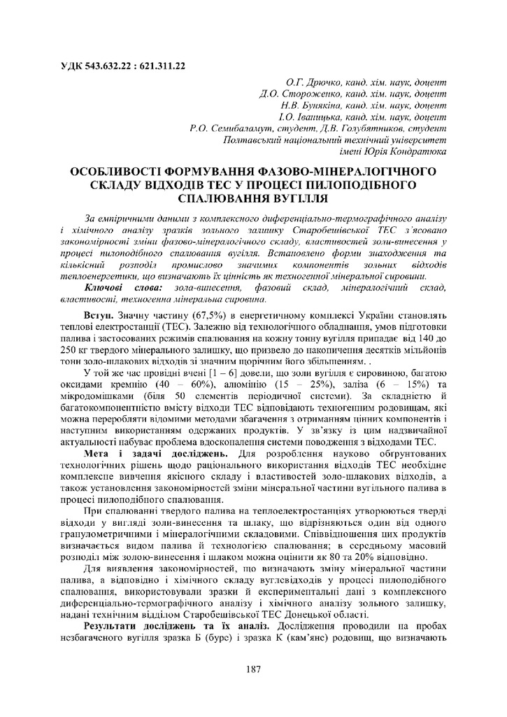 Особливості формування фазово-мінералогічного складу відходів ТЕС у процесі пилоподібного спалювання вугілля