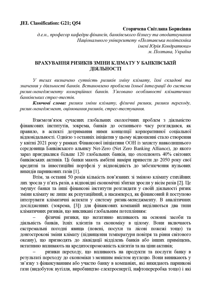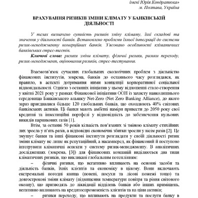 У тезах визначено сутність ризиків зміну клімату, їхні складові та значення у діяльності банків. ...