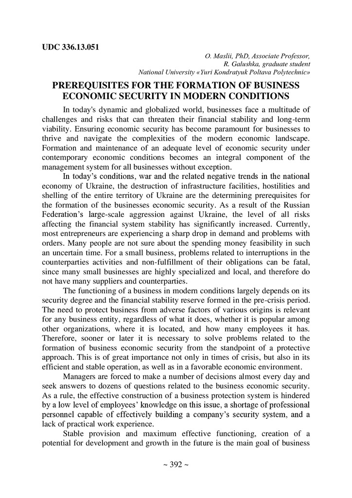 Prerequisites for the Formation of Business Economic Security in Modern Conditions