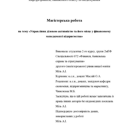У магістерській роботі розглянуто комплекс питань, пов’язаних із дослідженням теоретичних основ управління діловою активністю підприємства, узагальненням методичних засад управління діловою активні...
