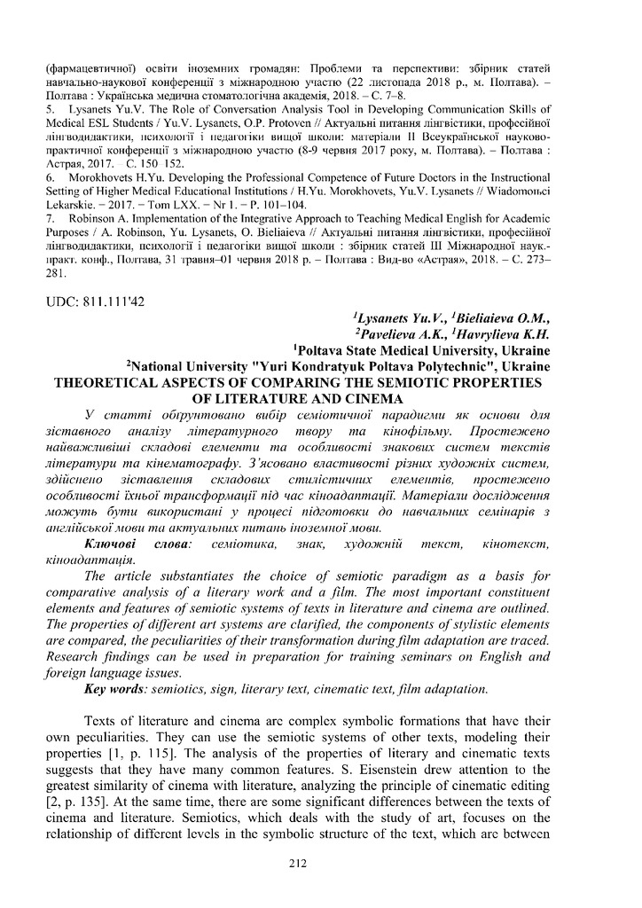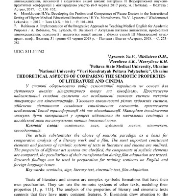 Стаття 2022/02/18Theoretical aspects of comparing the semiotic properties of literature and cinema