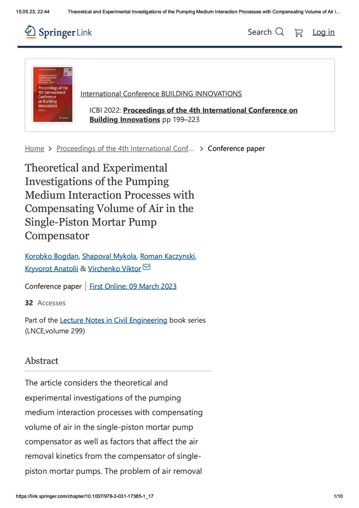 Theoretical and Experimental Investigations of the Pumping Medium Interaction Processes with Compensating Volume of Air in the Single-Piston Mortar Pump Compensator