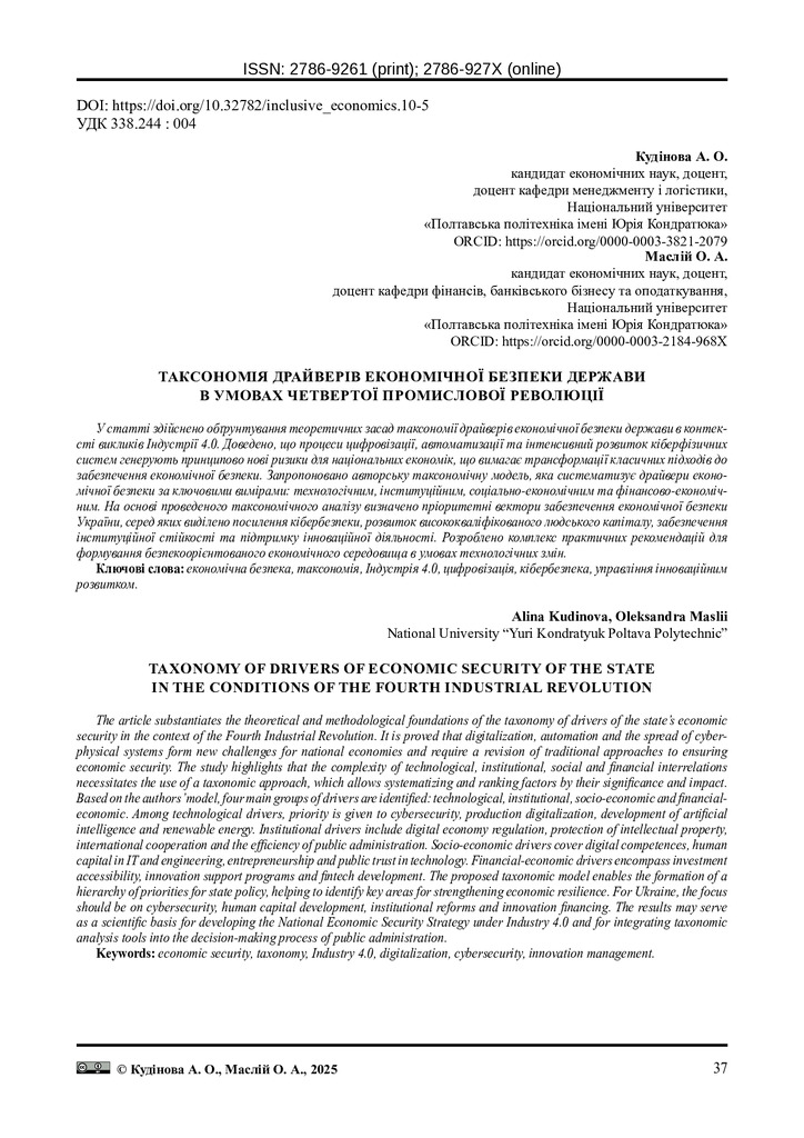 Стаття 2026/01/14Таксономія драйверів економічної безпеки держави в умовах четвертої промислової революції. Інклюзивна економіка