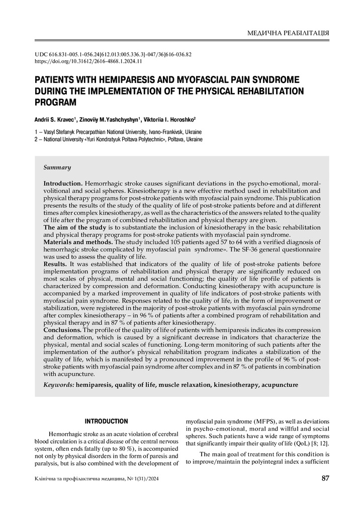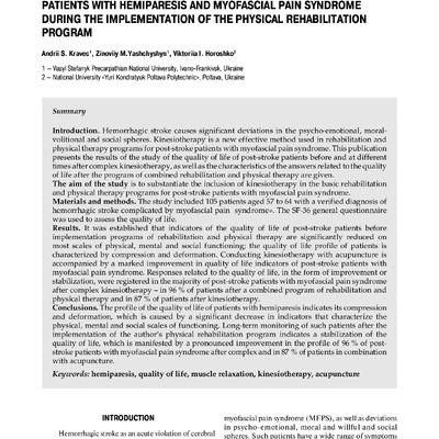 Стаття 2024/06/12Patients with hemiparesis and myofascial pain syndrome during the implementation of the physical rehabilitation program