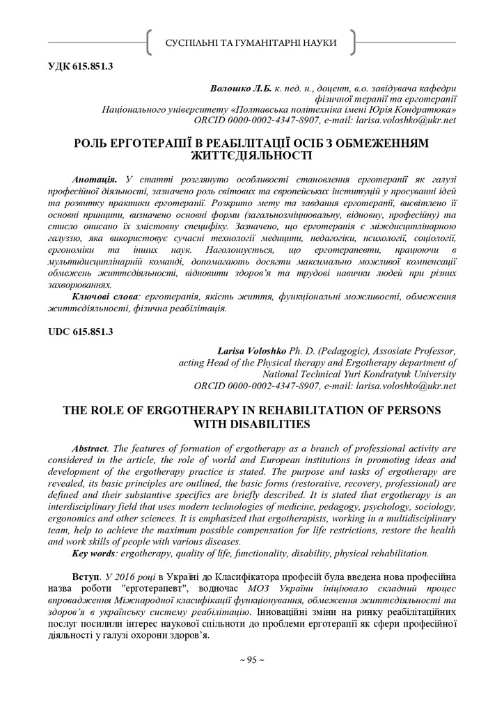 Стаття 2020/05/12Роль ерготерапії в реабілітації осіб з обмеженням життєдіяльності