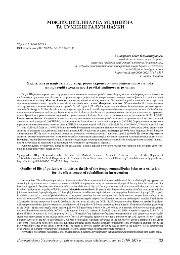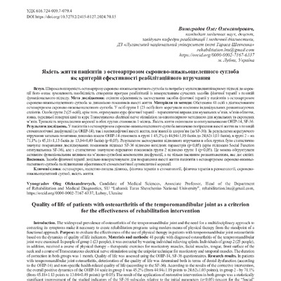 Стаття 2025/01/13Якість життя пацієнтів з остеоартрозом скронево-нижньощелепного суглоба як критерій ефективності реабілітаційного втручання