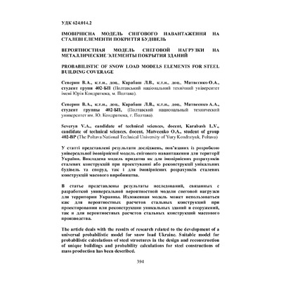 Подано пропозиції щодо шляхів застосування результатів комплексних імовірнісних досліджень снігового навантаження при проектуванні надлегких кроквяних сталезалізобетонних конструкцій.