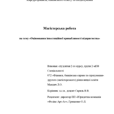 У випускній роботі розглянуто різні аспекти інвестиційної діяльності підприємств в умовах війни. ...