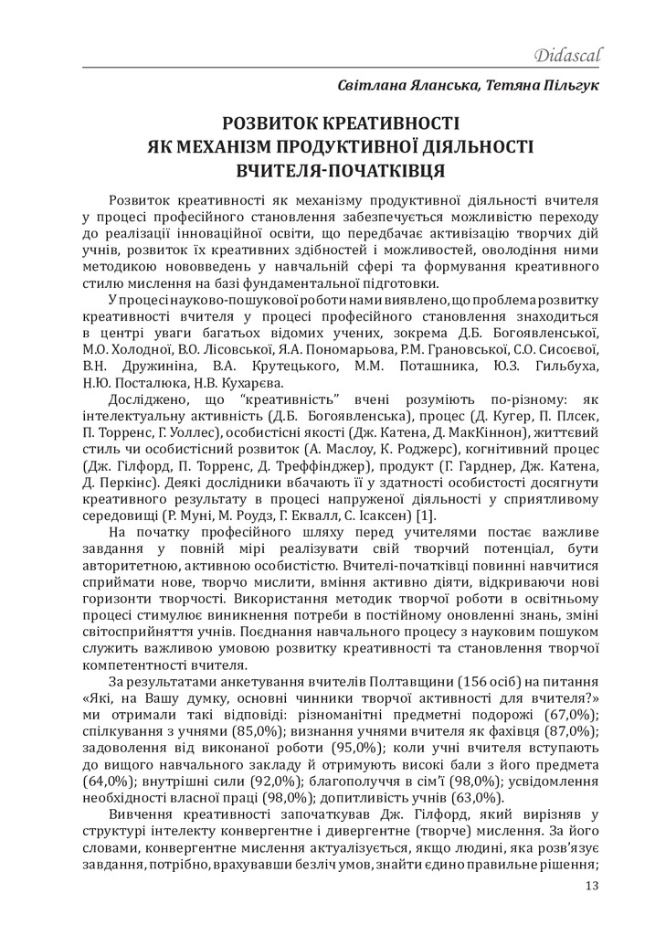 Розвиток креативності як механізму продуктивної діяльності вчителя у процесі професійного становл...