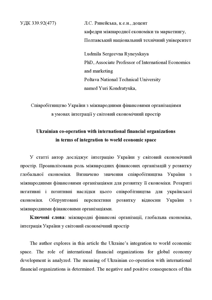 Стаття 2018/11/12Співробітництво України з міжнародними фінансовими організаціями в умовах інтеграції у світовий економічний простір