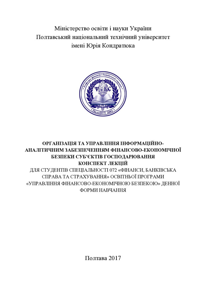 Конспект лекцій призначений для самостійного вивчення програмних питань з основ організації та управління інформаційно-аналітичним забезпеченням фінансово-економічної безпеки суб’єктів господарювання.