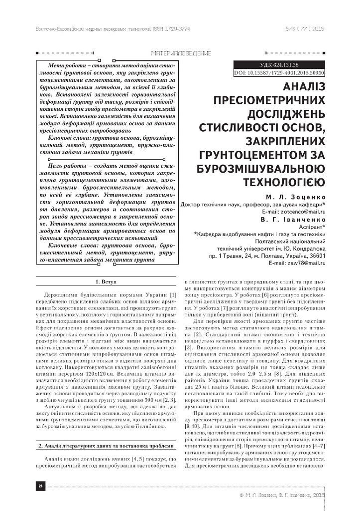 Стаття 2020/05/08Аналіз пресіометричних досліджень стисливості основ, закріплених грунтоцементом за бурозмішувальною технологією