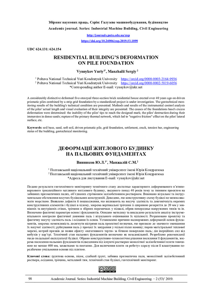 Стаття 2020/08/01Residential building deformation on pile foundation