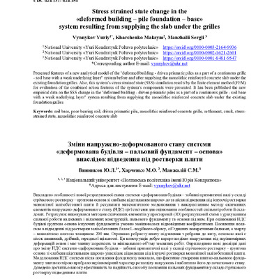 Стаття 2023/06/21Stress strained state change in the «deformed building – pile foundation – base» system resulting from supplying the slab under the grilles