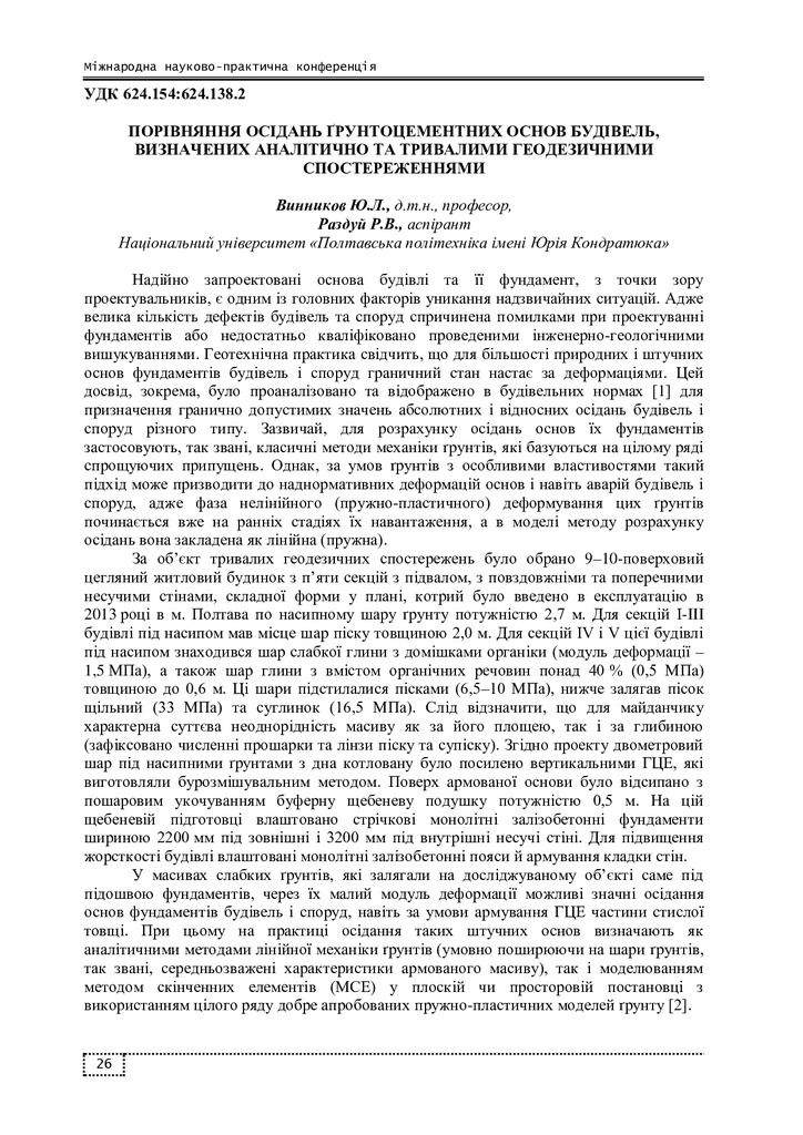 Порівняння осідань ґрунтоцементних основ будівель, визначених аналітично та тривалими геодезичними спостереженнями