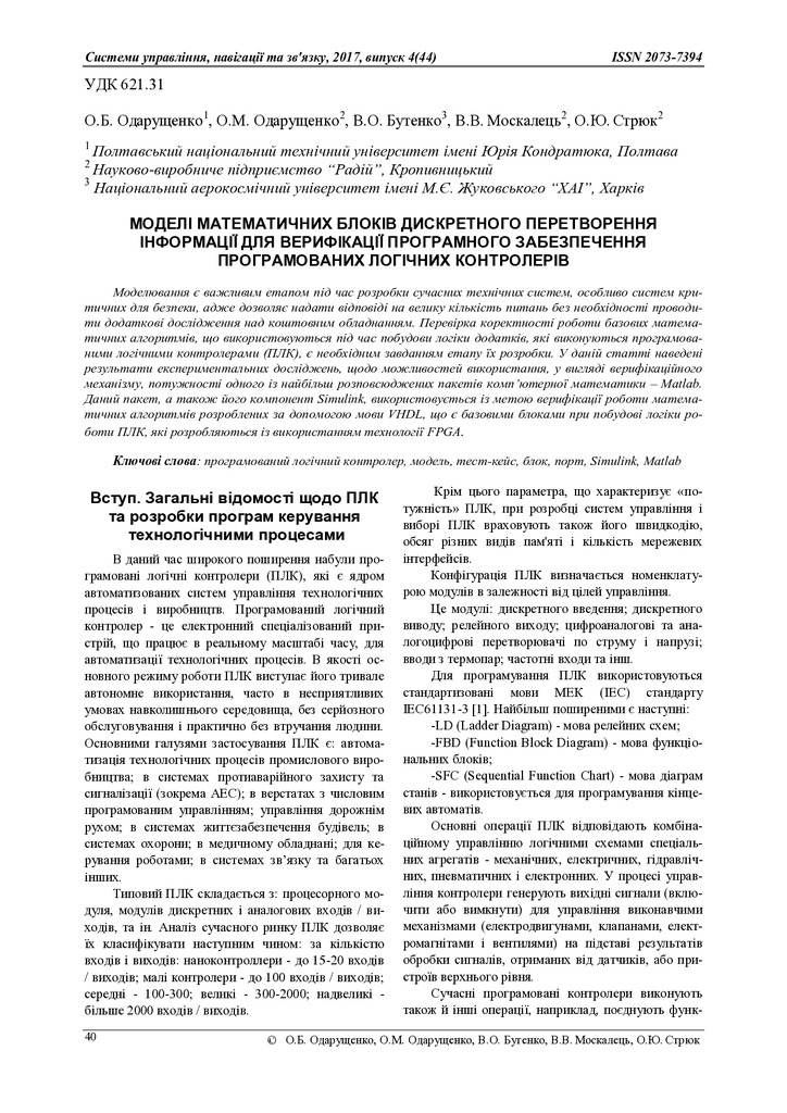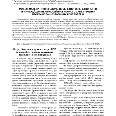 Стаття 2021/01/19Моделі математичних блоків дискретного перетворення інформації для верифікації програмного забезпечення програмованих логічних контролерів