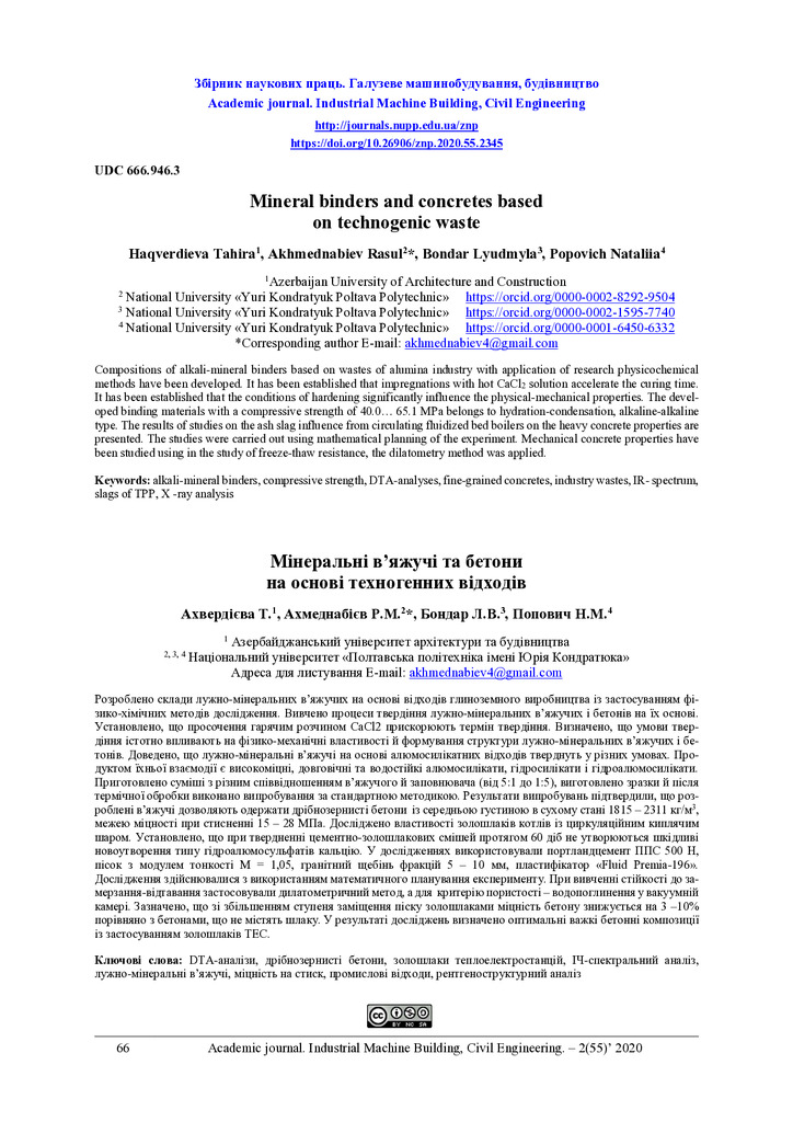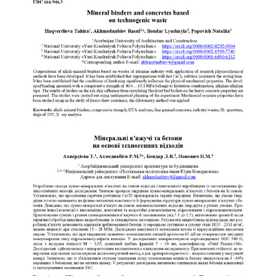 Розроблено склади лужно-мінеральних в’яжучих на основі відходів глиноземного виробництва із застосуванням фі зико-хімічних методів дослідження. Вивчено процеси твердіння лужно-мінеральних в’яжучих ...