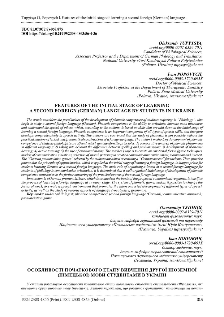 The article considers the peculiarities of the development of phonetic competence of students, who begin to study a second foreign language (German). The system of phonetic games makes it possible ...