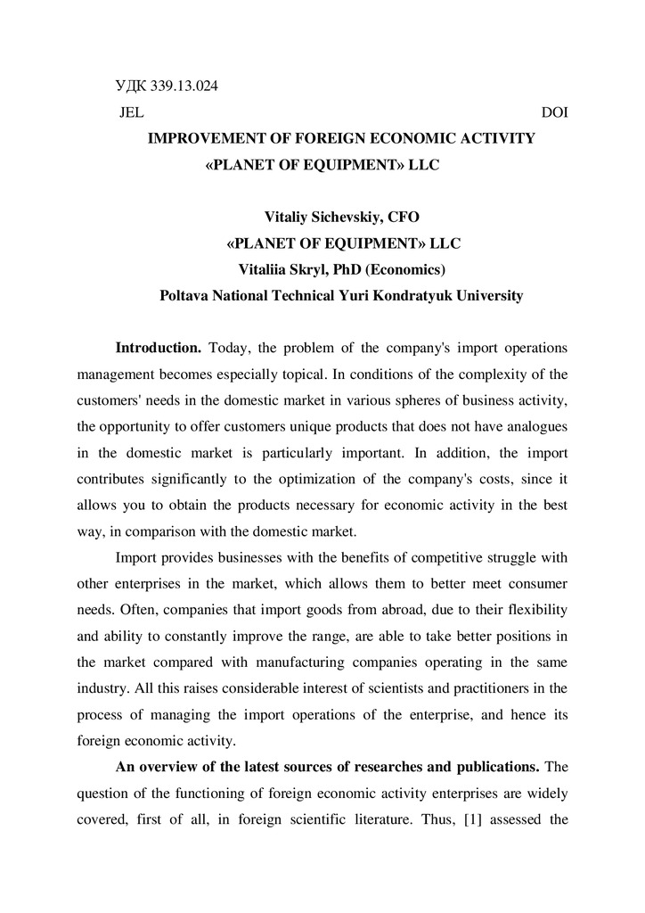 Improvement of foreign economic activity of «Planet of equipment» LLC