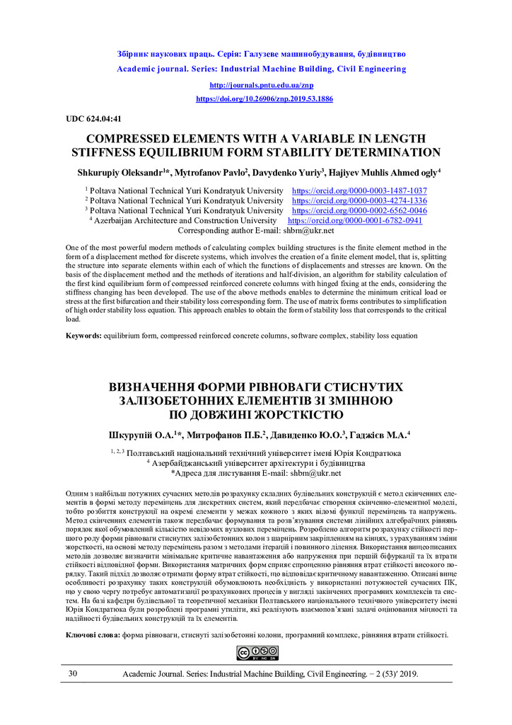 On the basis of the displacement method, together with the methods of iterations and half-division, an algorithm for stability calculation of the first kind equilibrium form of compressed reinforce...