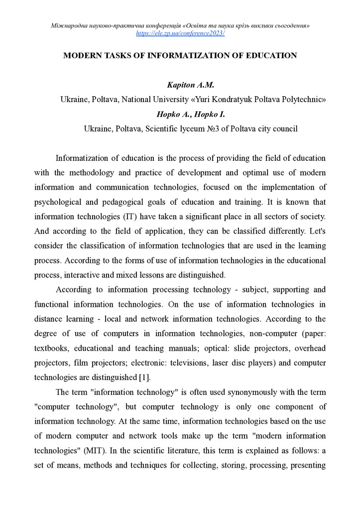 Informatization of education is the process of providing the field of education with the methodology and practice of development and optimal use of modern information and communication technologies...