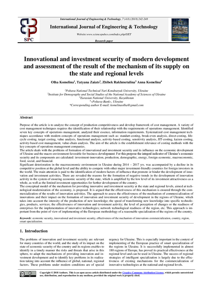 Innovational and investment security of modern development and assessment of the result of the mechanism of its supply on the state and regional levels