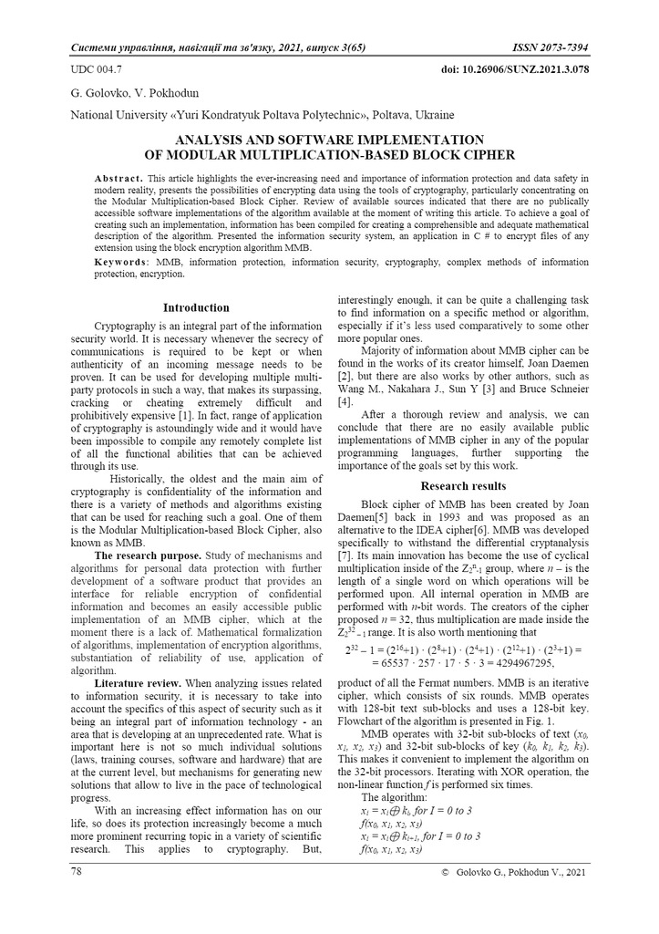 Стаття 2023/04/21Analysis and software implementation of modular multiplication-based block cipher