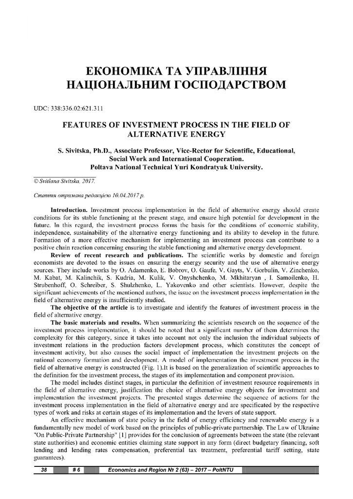 Стаття 2017/12/18Features of investment process in the field of alternative energy