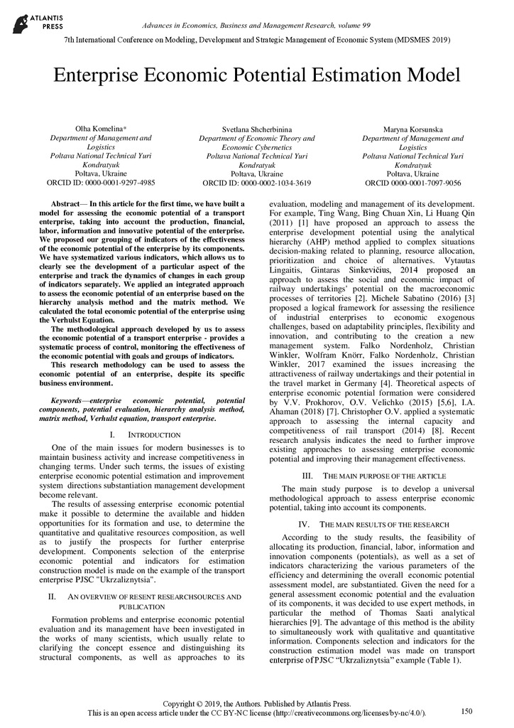 In this article for the first time, we have built a model for assessing the economic potential of a transport enterprise, taking into account the production, financial, labor, information and innov...