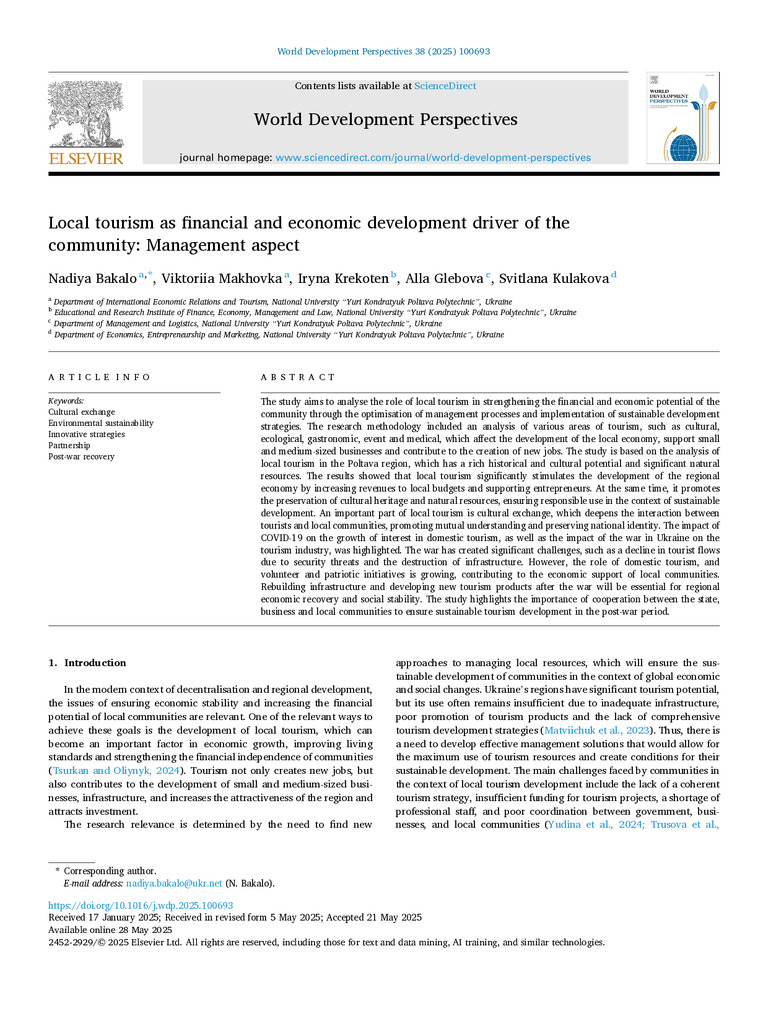 The study aims to analyse the role of local tourism in strengthening the financial and economic potential of the community through the optimisation of management processes and implementation of sus...