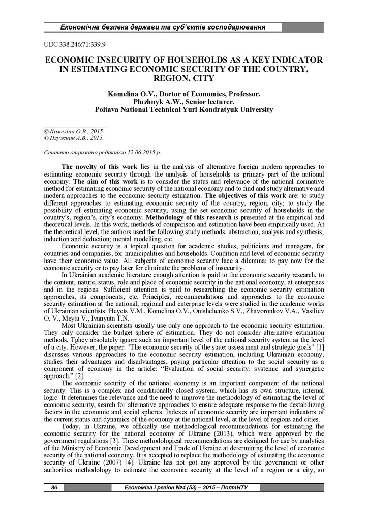 Economic insecurity of households as a key indicator in estimating economic security of the country, region, city